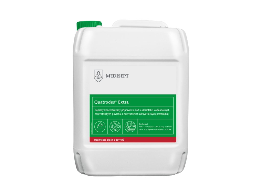 Quatrodes Extra je kapalný koncentrovaný přípravek s obsahem enzymu a nanomicelární technologií k účinné dezinfekci a čištění povrchů všech omyvatelných ploch, předmětů ve zdravotnictví, komunální a sociální oblasti.
